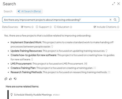 Direct Links to Source Data: Every response can include clickable citations. You can jump directly to the original KaiNexus Items at any time to verify information or explore the full context.