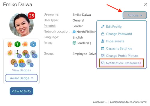 - Select the Actions button. In the resulting drop-down menu, select Notification Preferences.