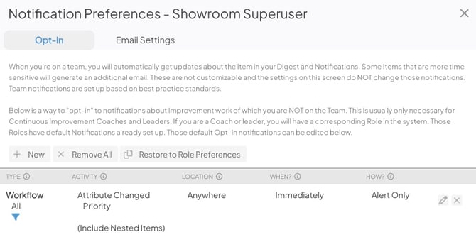 However, users can be "opted-in" to additional notifications about Items for which they are not on the Team. This is a great way for Continuous Improvement Coaches and leaders to keep up-to-date on Items throughout their department or organization. Each of a user's Roles may have default notification preferences already configured by your organization, but their notification preferences can be further customized to make sure they get the right notifications at the right time.