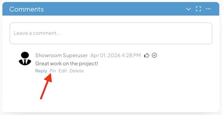- Pinned comments will appear at the top of the Comment Card with a grey pin icon beside it.