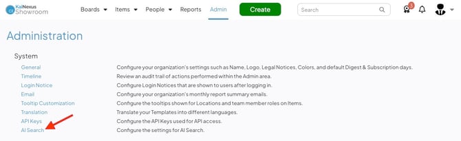 To configure the organization's AI Search settings, navigate to the Admin section, then: