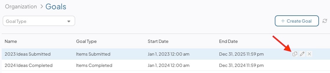 - Hover over an existing Goal, and select the copy icon.