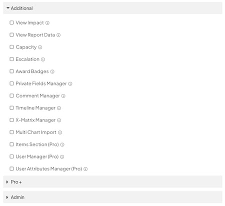 - Under the Additional, Pro+, and Admin headers: