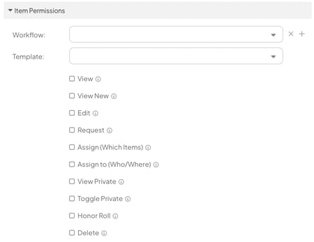 Pro Tip: The Workflow and Template fields have an "or" relationship. For example, entering a Workflow and a Template applies the permissions to all Items that belong to either the Workflow or the Template.