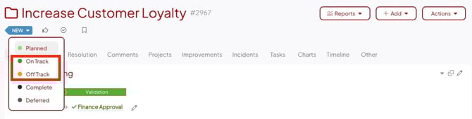 - Distinguish different versions of the same Status Type. For example, if you manage projects in KaiNexus, creating "On Track" and "Off Track" versions of Active Status will help you better categorize your projects.