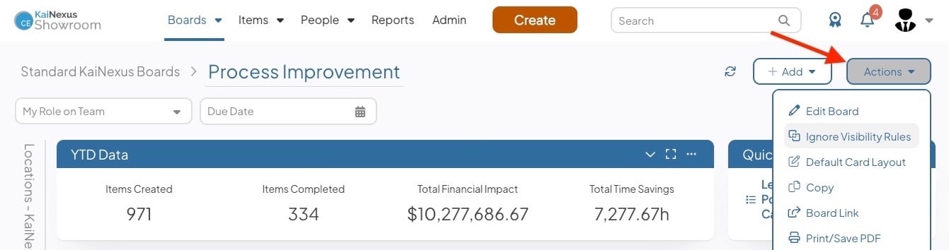 - Select the Actions button at the top right of the Board.