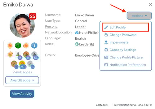 - Select the Actions button. In the resulting drop-down menu, select Edit Profile.