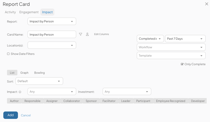 When creating an Impact by Person Report Card, you use the same filters discussed in this article to build the Report. However, you will have an additional Sort option when the Report is in List view.