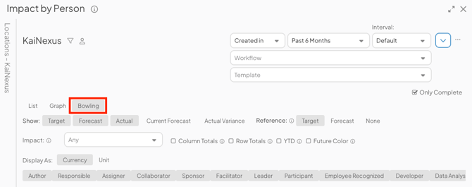 - Bowling view displays Impact data for Items with which each user is associated as a bowling chart, color-coding the Actual Impact based on whether or not it matches or exceeds the Target or Forecast Impact.