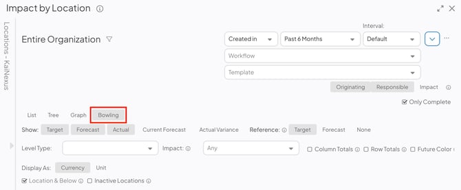 - Bowling view displays each Location's Actual, Target, and Forecast Impacts as a bowling chart, color-coding the Actual impact based on whether or not it matches or exceeds the Target or Forecast impacts.