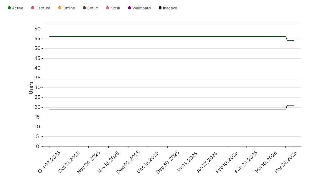 This Report displays the number of Active, Capture, Setup, and Inactive users. If your organization has the Wallboard and/or Kiosk modules enabled, the number of Wallboard and/or Kiosk users will be displayed as well.