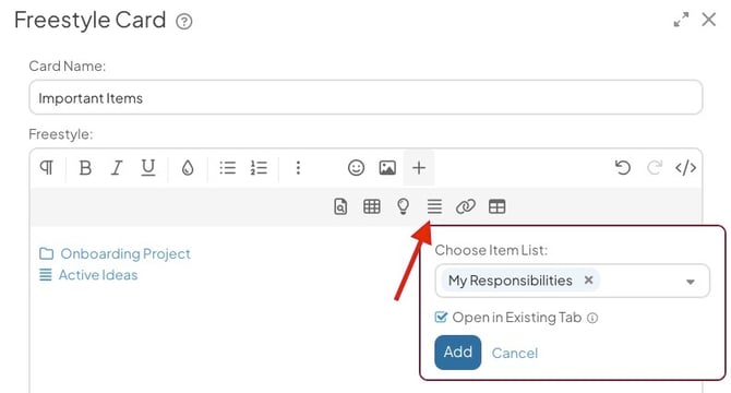 - Insert Item Link: Add a link to any Item you have permission to view. The corresponding icon for that Item will appear beside its name.