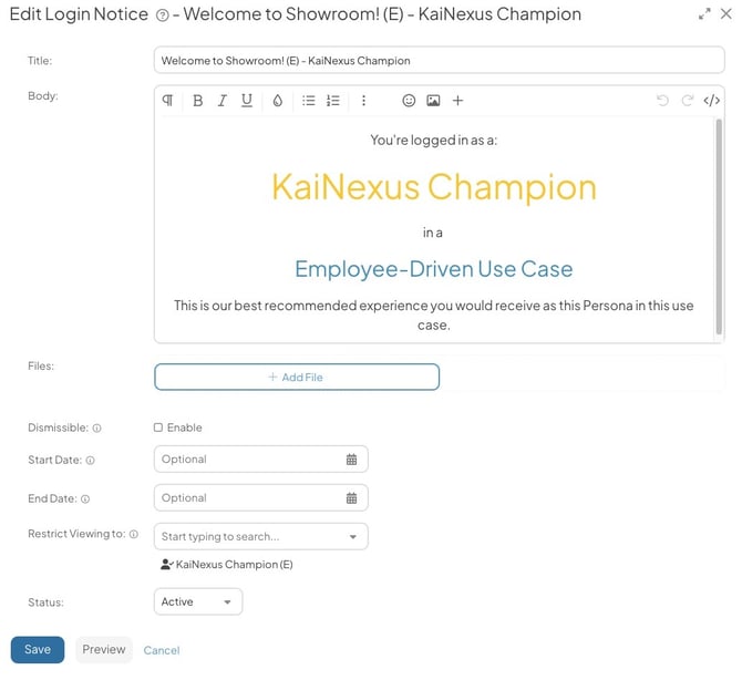 - Status: Expand this drop-down to select the Login Notice's current status. If "Active," the Login Notice will begin appearing for users immediately (or as soon as the configured Start Date is reached). If "Inactive," the Login Notice will not appear for users.
