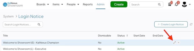 - Hover over the Login Notice you want to edit so that it's highlighted blue, then click the pencil icon that appears to its right.