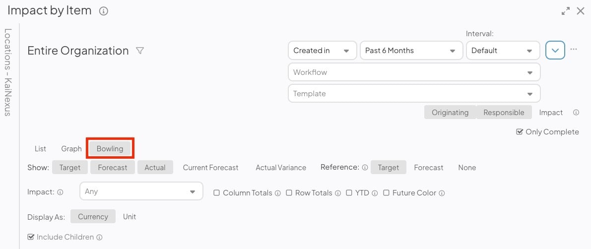 • Bowling view displays each Item's Actual, Target, and Forecast impacts as a bowling chart, color-coding the Actual impact based on whether or not it matches or exceeds the Target or Forecast impacts.