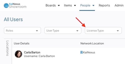 You can filter users by License Type in the User Filter, or in the People and User Management sections. From here you can use the License Type Quick Filter to quickly update which users you're looking at.