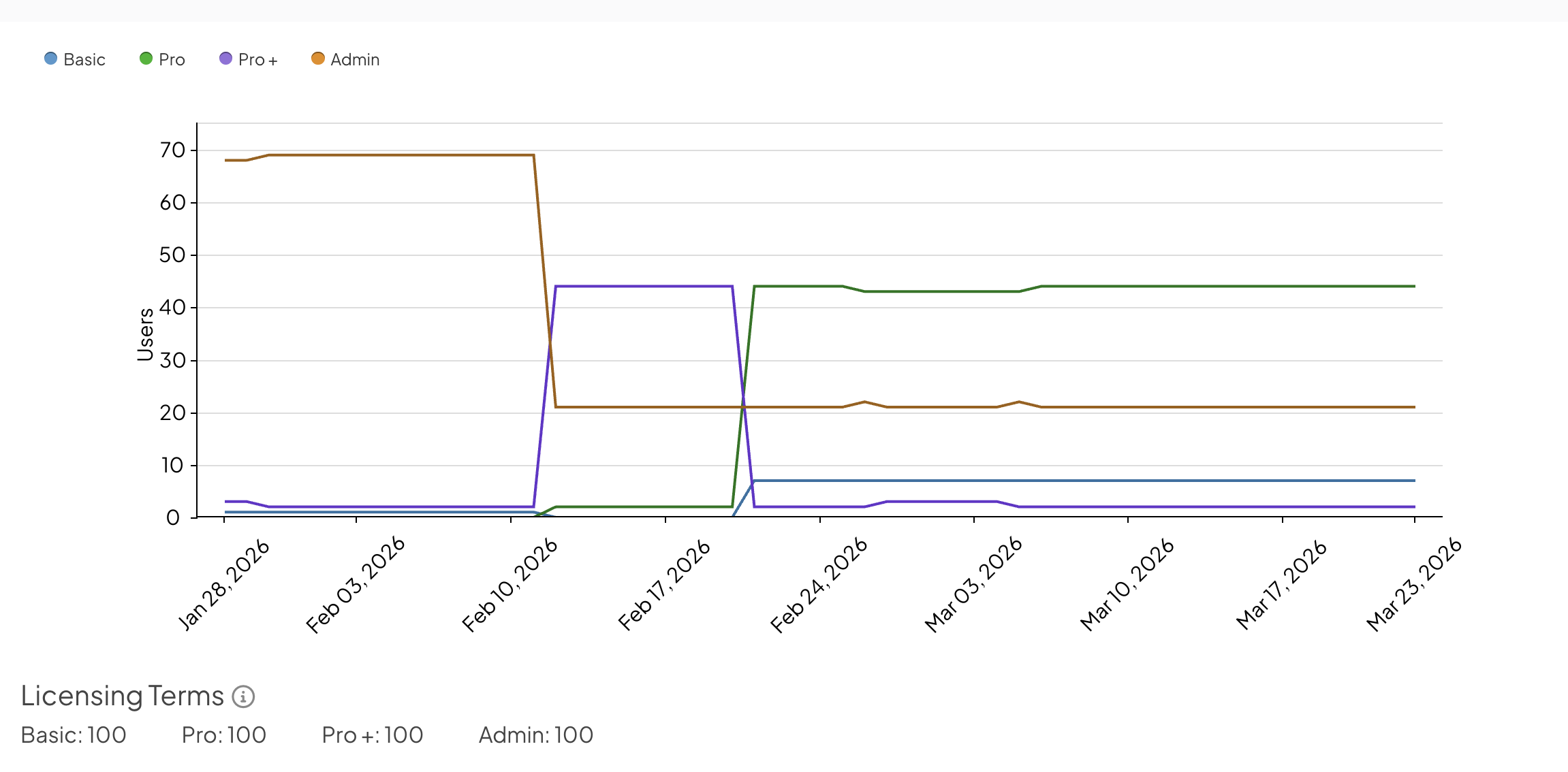 The User License Counts Over Time Report displays the number of users with each License Type across your organization over time. This report helps track trends and ensures you stay within your licensed limits.