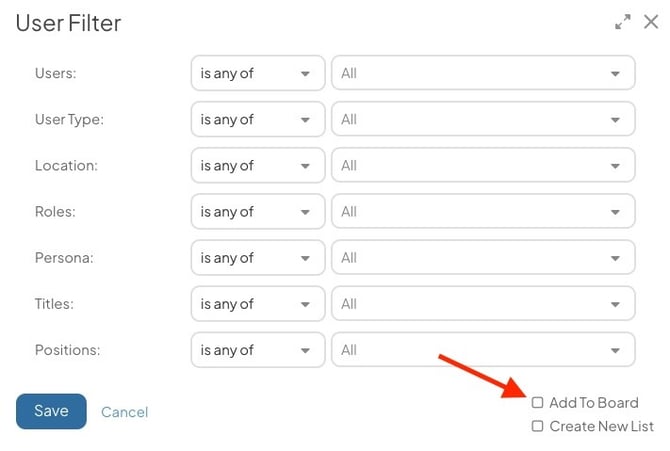 - Has not viewed: This option is only available for the "Viewed Board" criterion. With this configuration, people must not have viewed one or more of the selected options in the past 90 days.