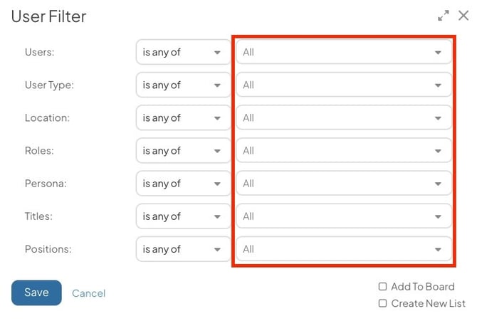 - Select the filter icon to set criteria for the types of Items the filter references. For example, specifying a Template ensures your List only includes users who held the specified Team Role on that Template.
