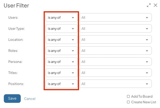 - Is not any of: With this configuration, people must not match one or more of the selected options.
