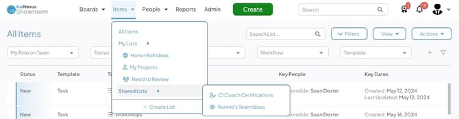 To access Lists that have been shared with you, click the Items drop-down in the navigation bar.