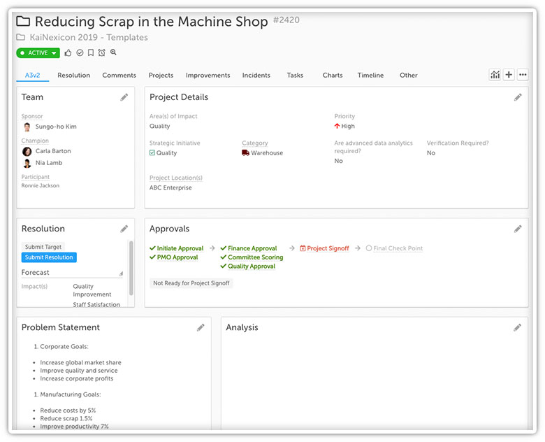 Templates are the building blocks of your Workflow. Each Template is a custom framework that governs what information people capture and track when working on improvement. Some common Templates are Tasks, Just Do Its, Charts, Projects, and OIs.