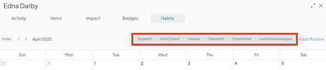 In addition to using Habit Scores to track engagement, you can also use the Habits Calendar. The Habits Calendar is a dynamic calendar located in your User Profile that tracks which key habits were performed each day. It helps you visualize your daily activity patterns over time.