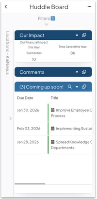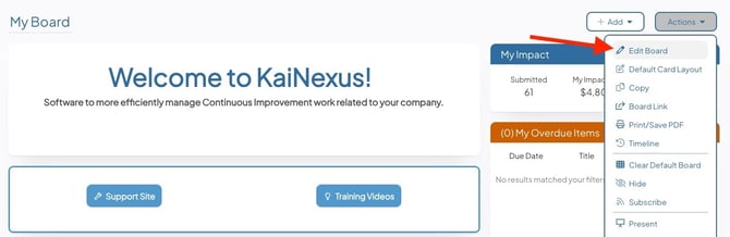 Boards play a crucial role in managing improvement work in KaiNexus. Often the first thing users see when signing in, they offer key information to help you efficiently achieve your goals within the platform.