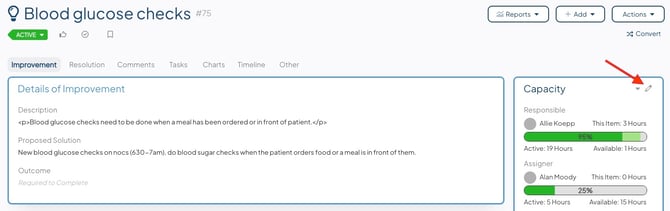 - To edit the team’s current commitment to the Item, hover over the Capacity Panel and click the pencil icon.