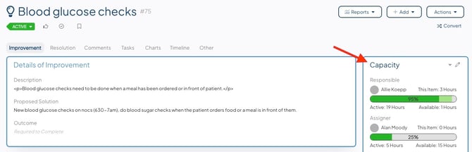 The Capacity Panel on an Item will display the team's Current Capacity. This is helpful when adjusting commitments during an ongoing project.