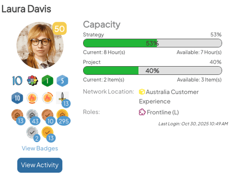 If you have the Enable Capacity or Capacity Administrator permission, you can see a user’s Current Capacity when you hover over their name or profile icon anywhere in the system.